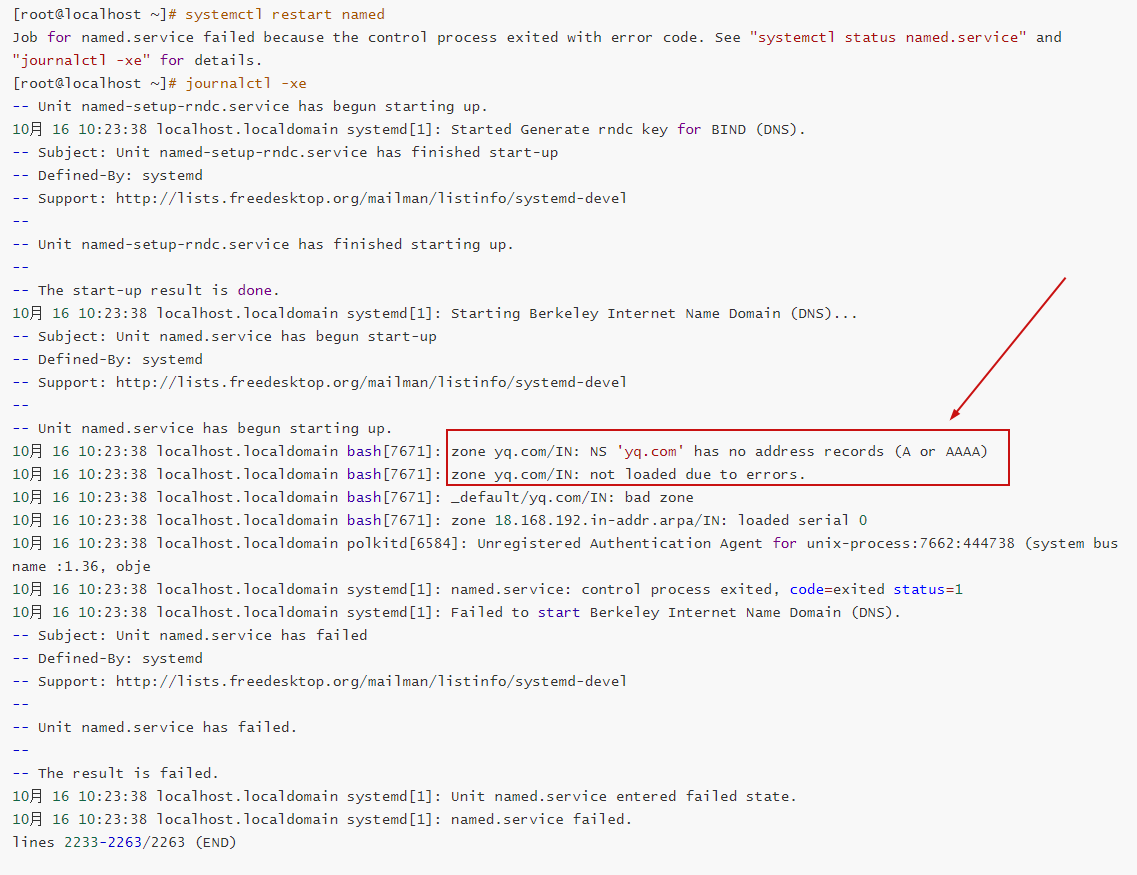 原因:/var/named/yq.localhost /var/named/yq.loopback 配置文件内容有问题