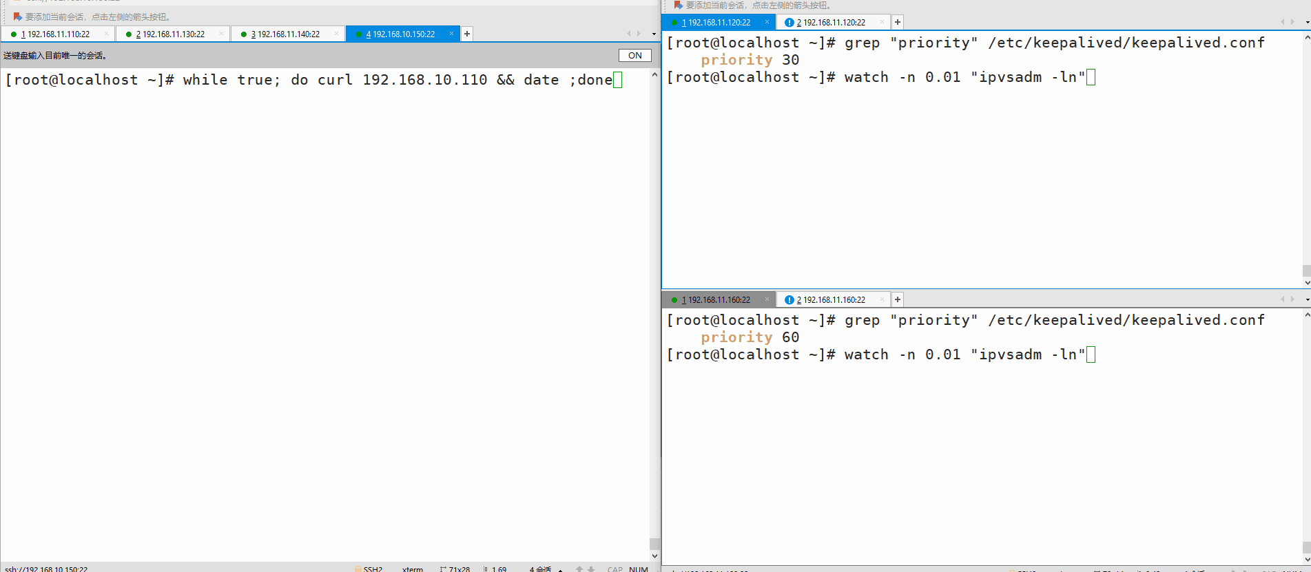 修改7-2、7-6 keepalived.conf配置文件中的priority选项优先级(数字越大,优先级高,修复后作为主)c