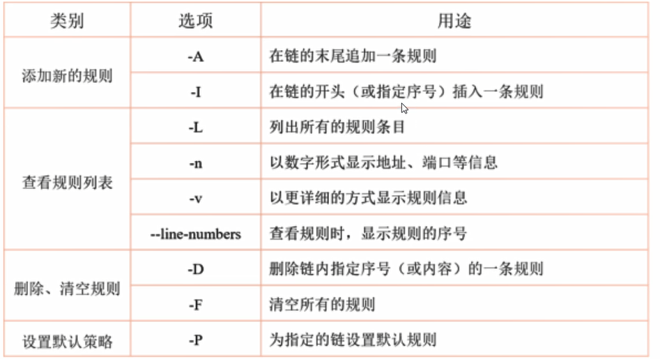 iptables [t 表名] 选项 [链名] [条件] [-j 控制类型]