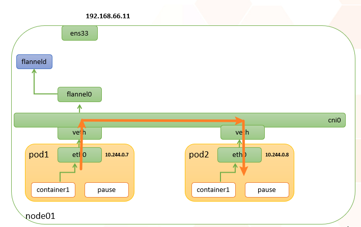 同物理机:通过当前节点的网桥实现转发(二层网络)
