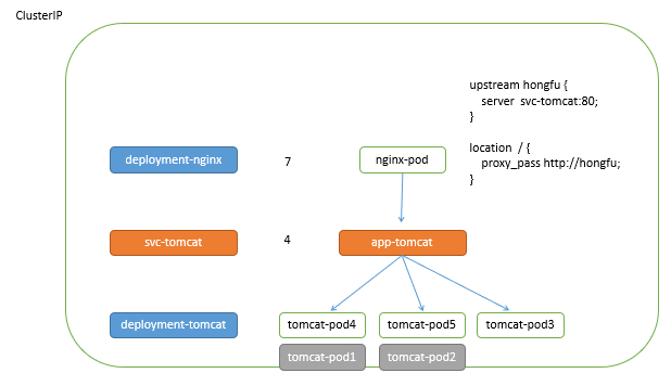 nginx控制器 指向 svc调度器,svc调度器 再去管理 tomcat控制器 。若 tomcat控制器 管理的 pod 出现故障,则直接由 tomcat控制器 重建 pod ,而 svc调度器 也会做出对应的负载调整