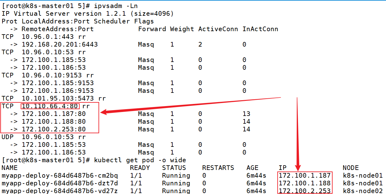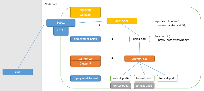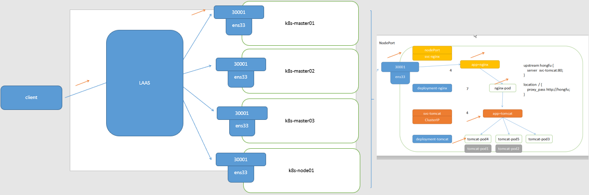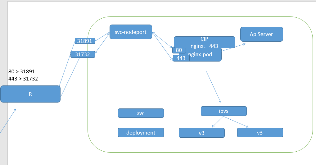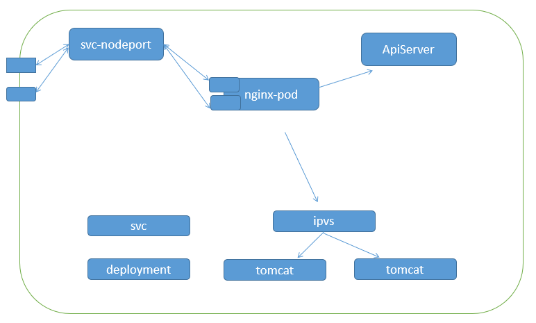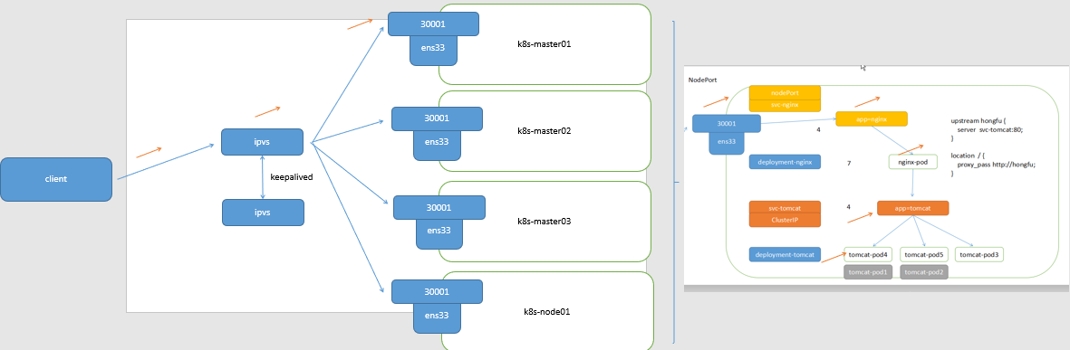 当客户端访问节点的 <NodeIP>: NodePort ,由 ipvs 负载到集群内部的 nginx-pod ,再转发至 clusterip 调度器的负载均衡中,再转发到真实的服务器