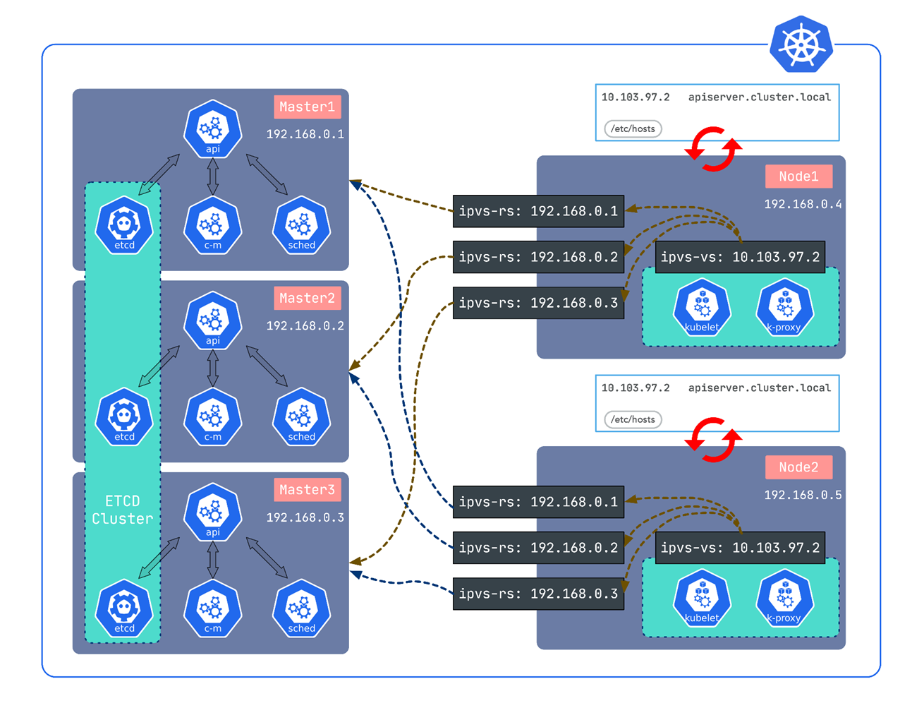 初始化集群时,通过域名指向各个节点的 ApiServer( 每个master 指向自己,node节点指向ipvs-vs )