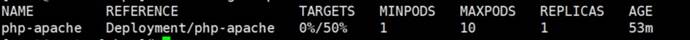 命令创建HPA,作用在php-apache的deployment控制器上(维持pod的CPU使用率在59%,若超过则增加pod,若减少则减少pod,最大10.最小1)
