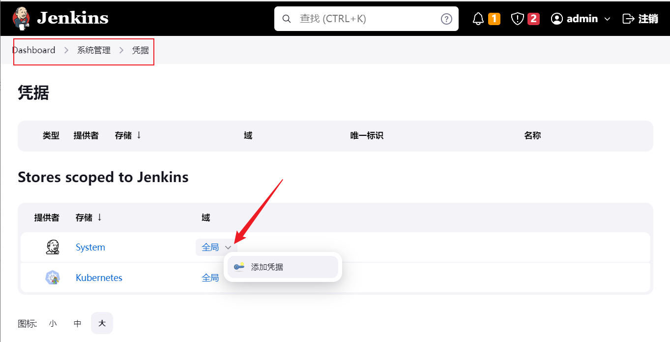 首页------>系统管理à管理凭据------- >点击 Stores scoped to Jenkins 下的第一行 jenkins,显