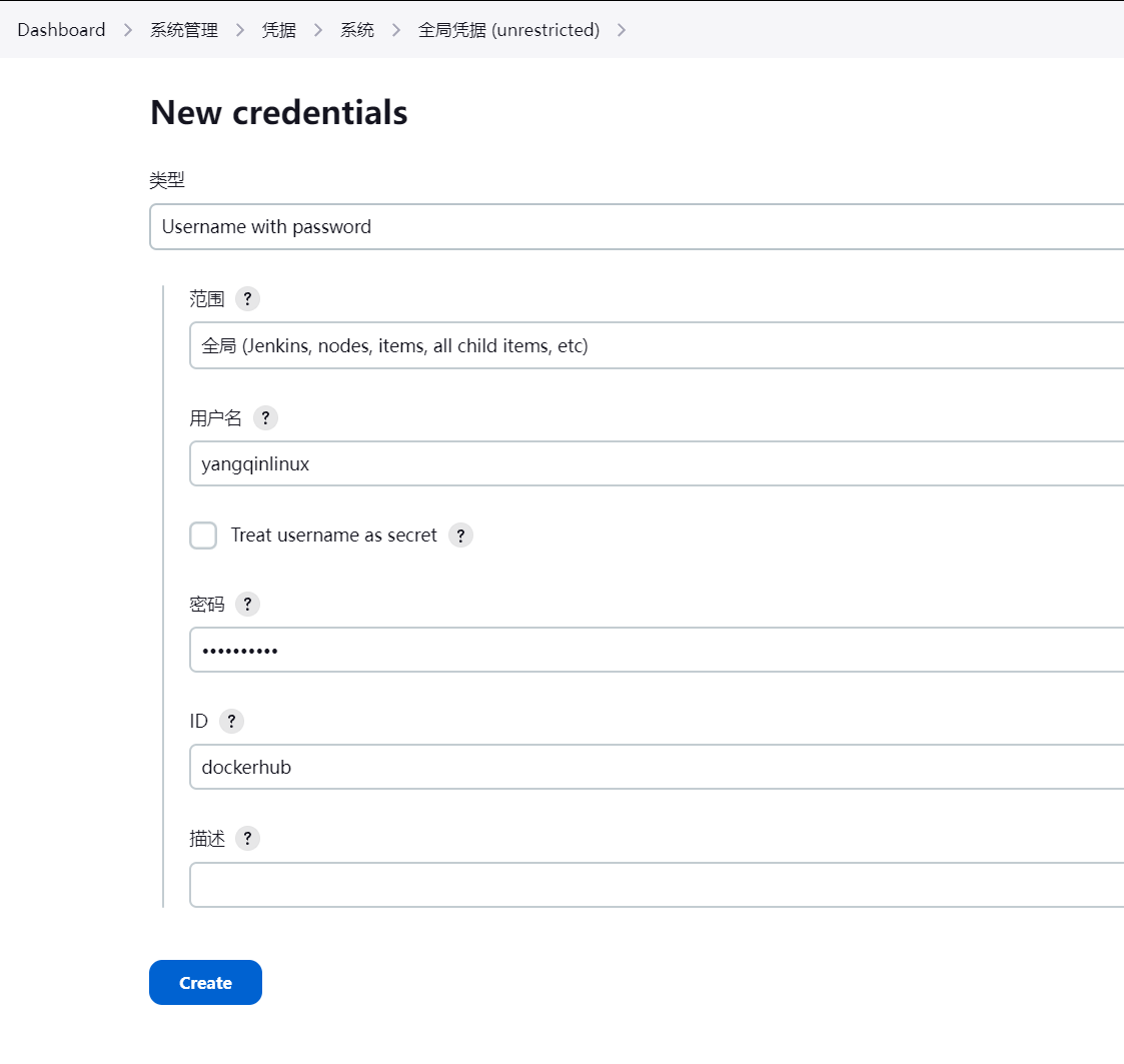 注意:下面需要用到 dockerhub 存放镜像,大家如果没有 dockerhub 可以自己申请一个首页------>系统管理 àcredentials--à全局--à添加凭据