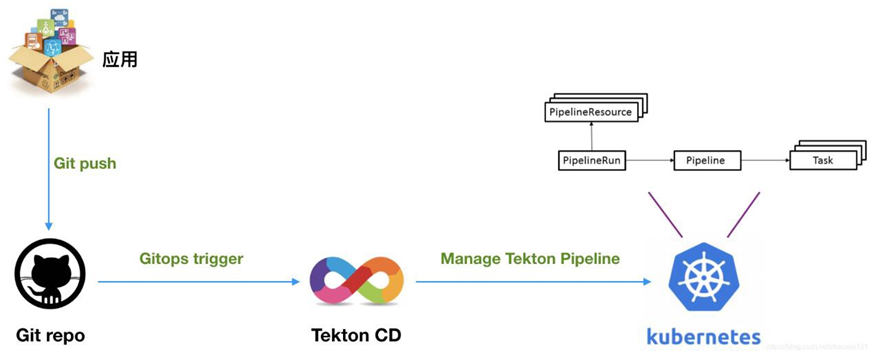 3、Tekton CD (一个 K8s Operator) 会监听到相应的改动,根据不同条件生成不同的 Tekton Pipelines;