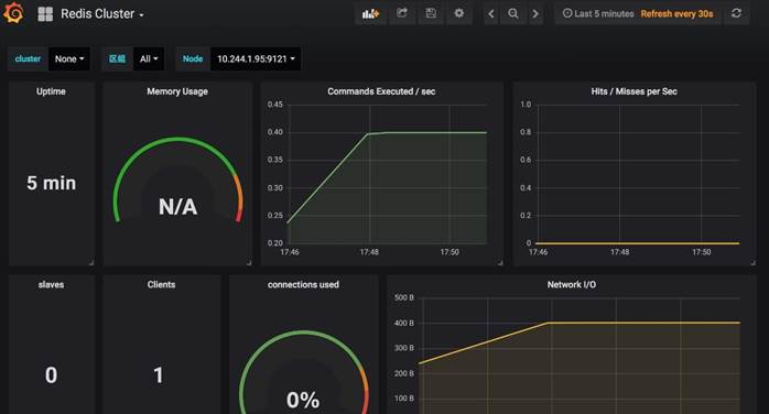 在 grafana 导入 redis 的json 文件 Redis Cluster-1571393212519.json,监控界面如下:
